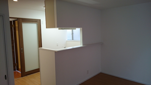 キッチンを移動させ対面にしてみました。シーリングライトがまだついていないので暗いのはお許し下さい。
